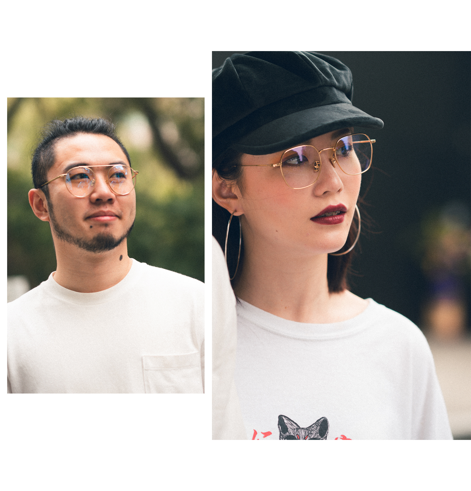 男生臉上為大圓的KP05框型,去除鼻樑連結處,讓金邊細框顯得前衛時尚感,而鼻樑較寬的朋友再也不用擔心鏡框鼻距過窄的問題;而女生所配戴的KC1015,同為金邊細框,比例上設計較為正方形,更為復古經典,推薦給具有復古魂與圓臉型的朋友。