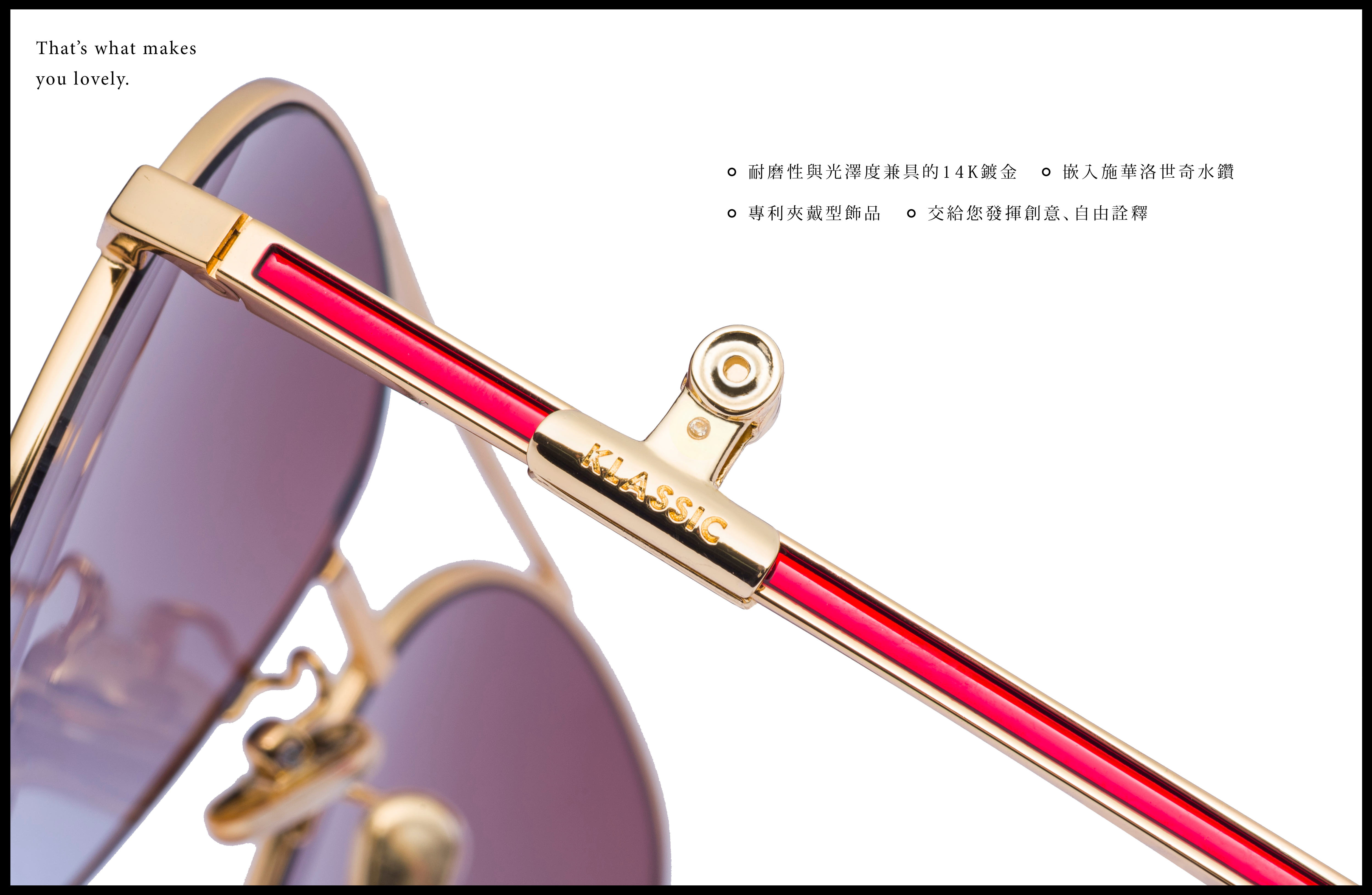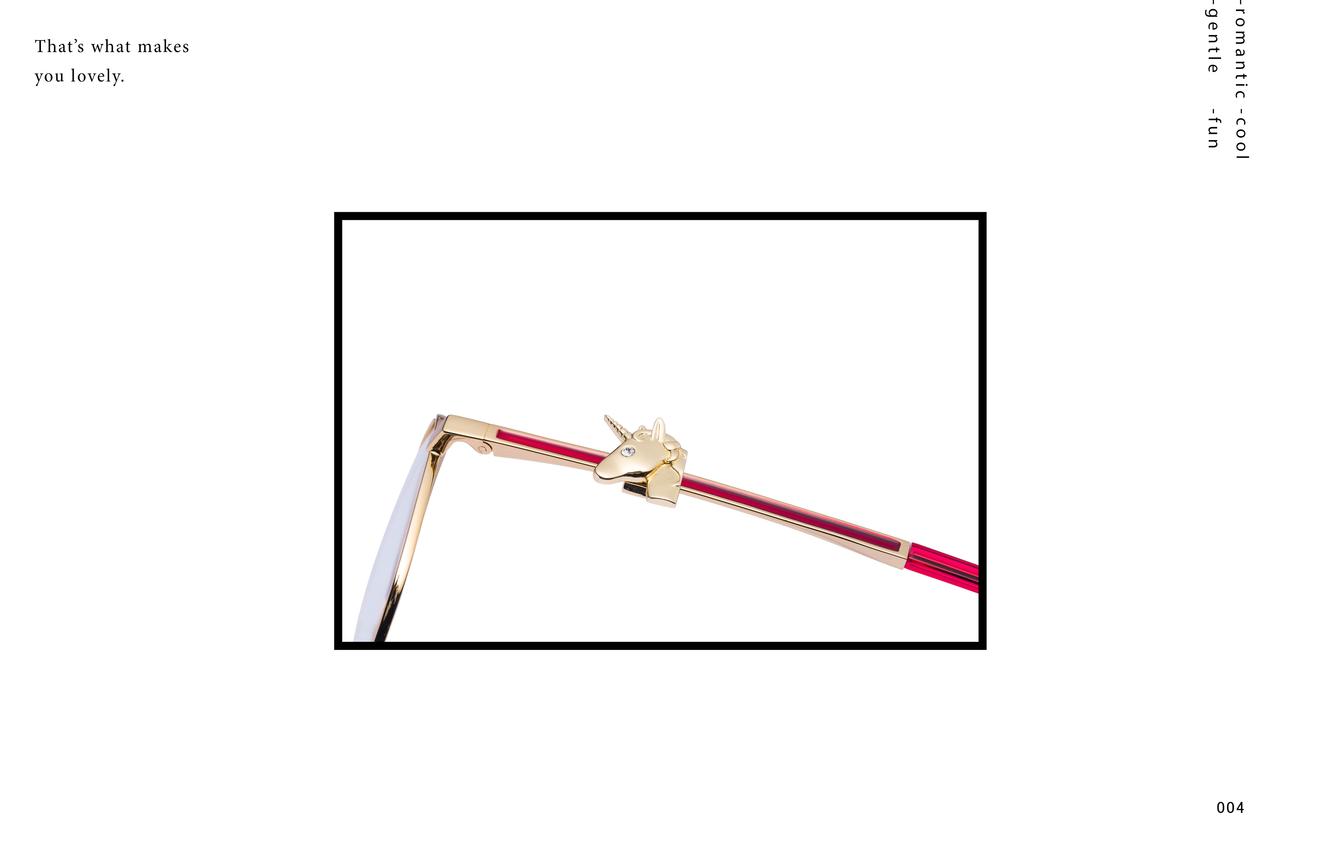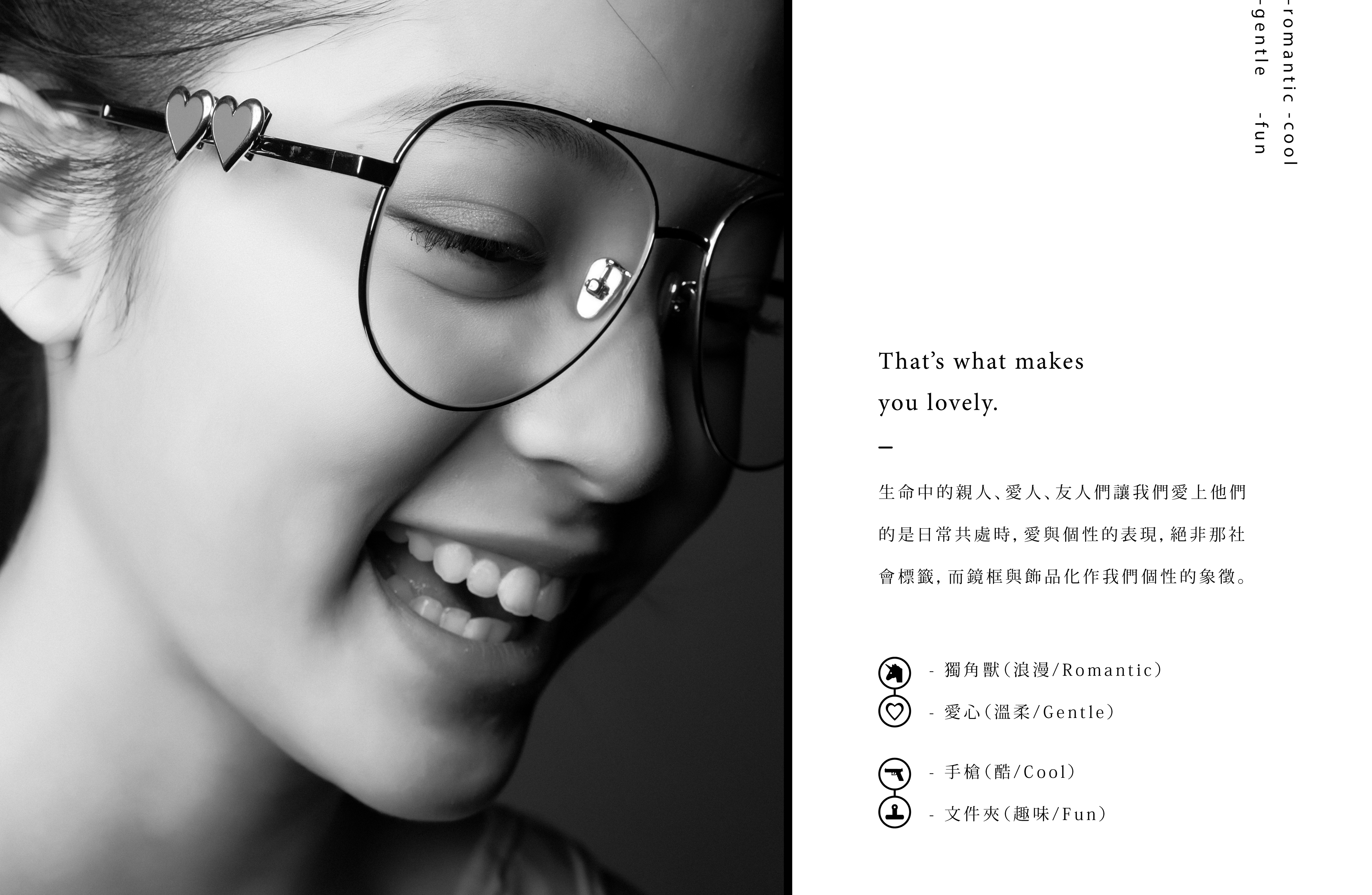 框型設計上皆以KlassiC.品牌經典框型KC9000為基底,著重於改良經典框型與配戴舒適度,另一方面也嘗試為鏡框帶來各種不同的可能性,除了眼鏡鍊之外,還能有甚麼呢?本次亮相的鏡框飾品夾〔Frame Clips〕,為團隊與妮妮共同發想打造,針對「That’s what makes you lovely」定義出四種惹人喜愛的個性,揉合著妮妮的喜好,設計獨角獸(浪漫)、愛心(溫柔)、手槍(酷)、文件夾(趣味)四款圖案。