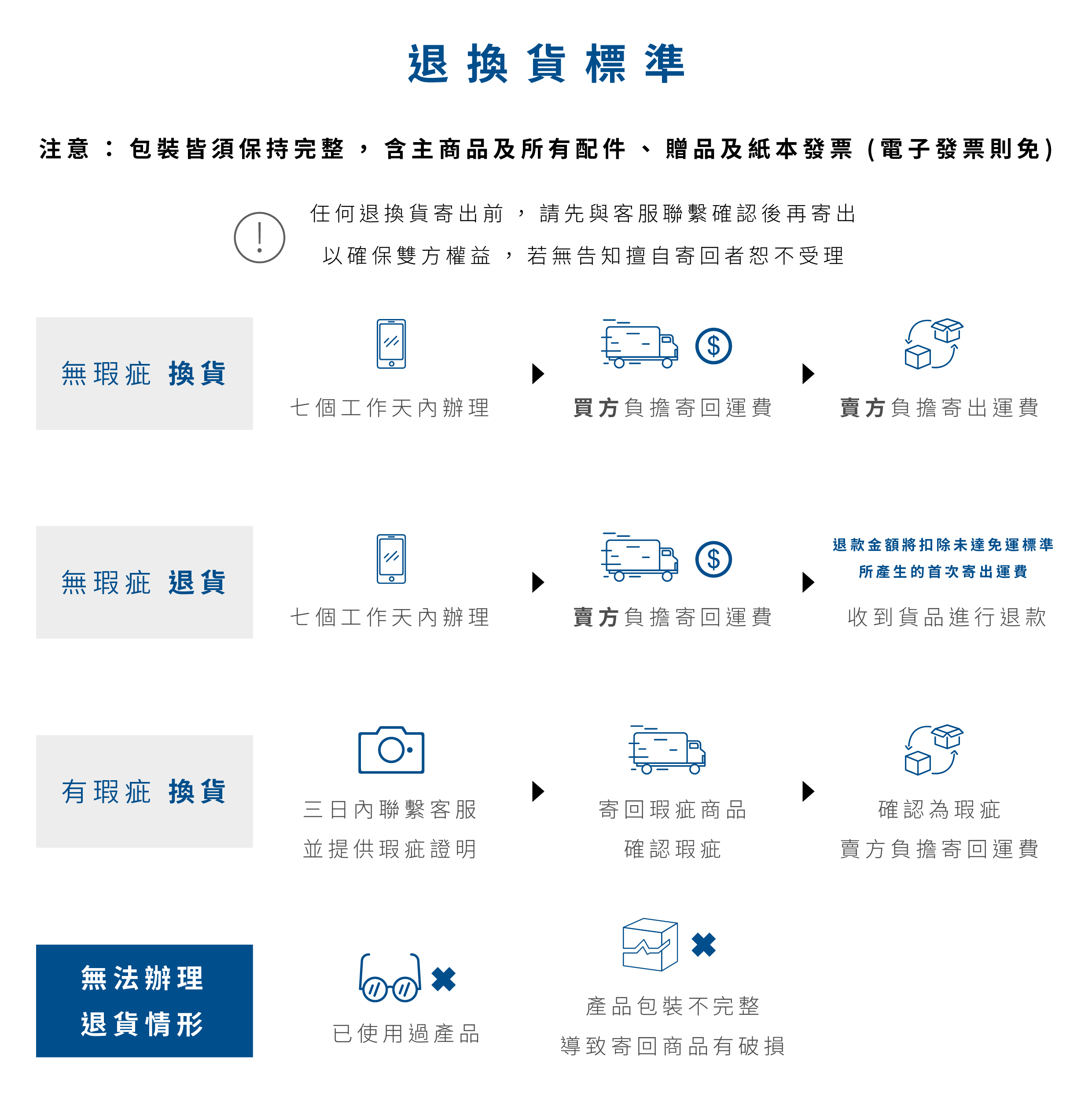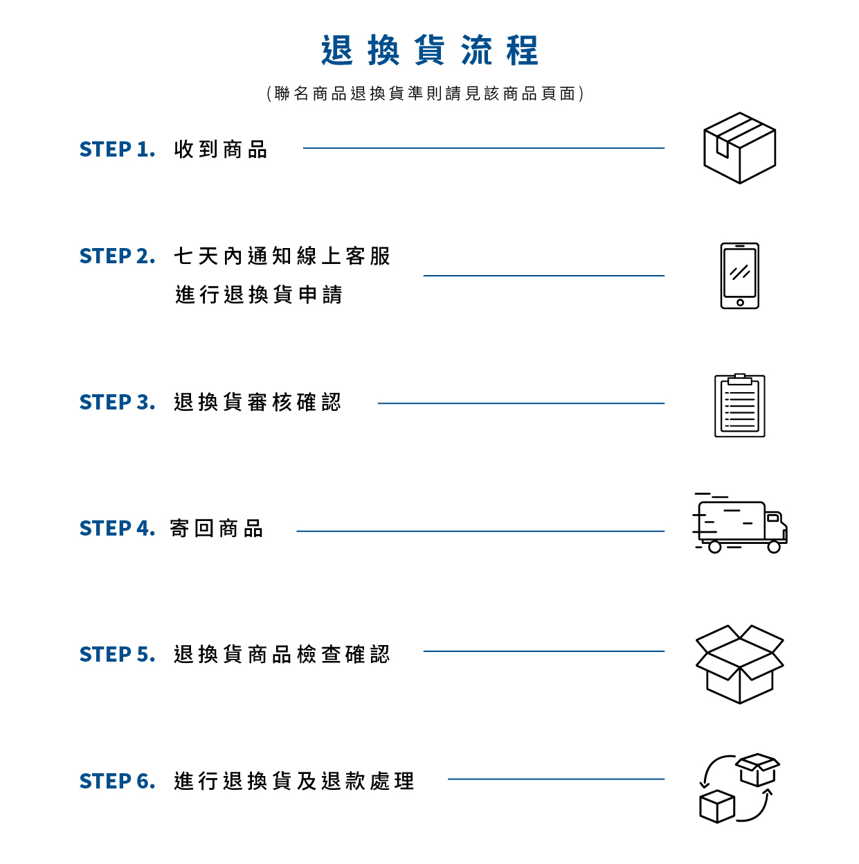 4. 為避免造成收件紊亂而耽誤作業程序,凡退貨請使用7-11店到店或宅配方式退回,寄件資訊請洽網路客服。