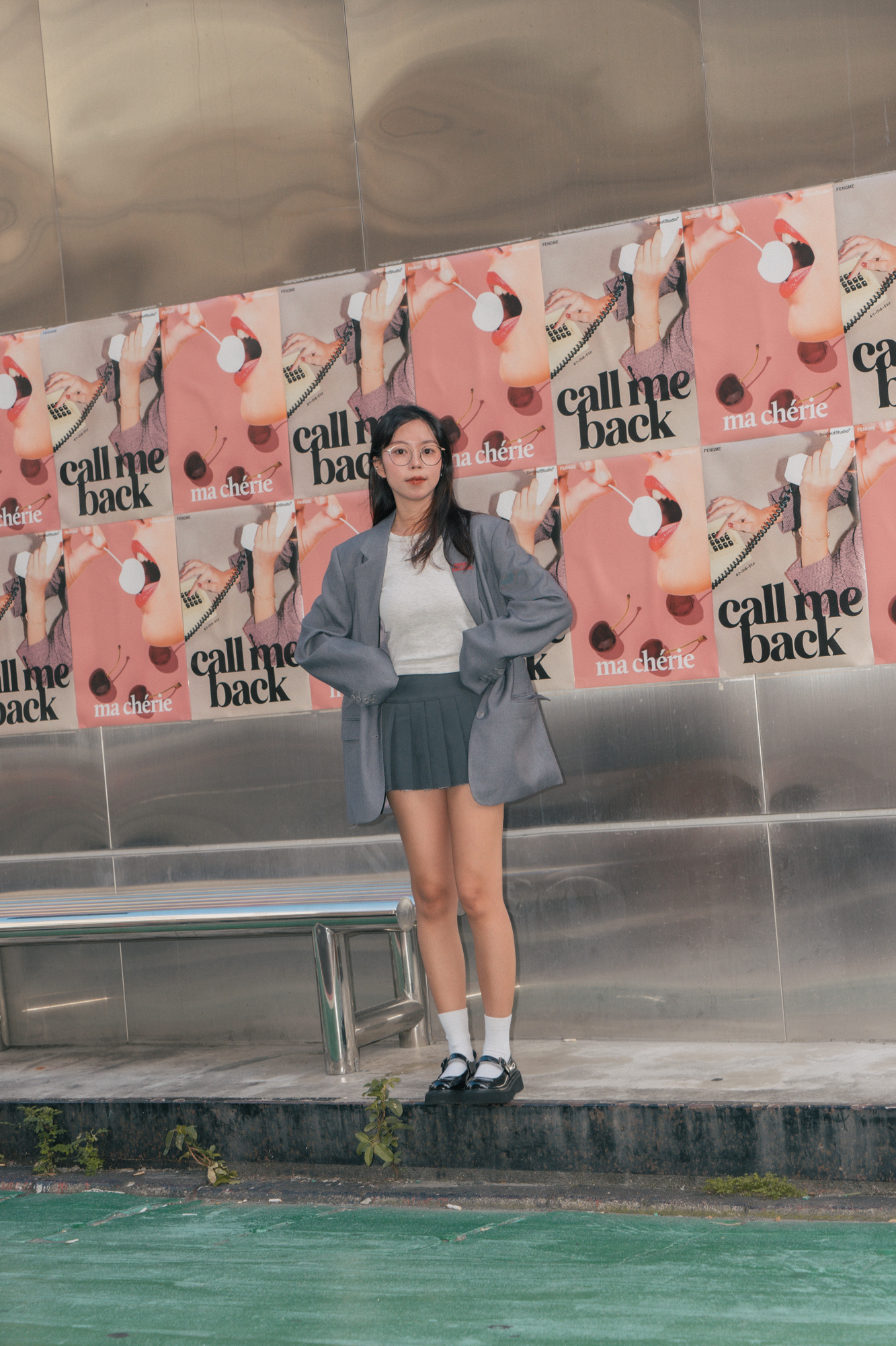 以 oversize 的上身與 Y2K 的低腰百褶裙打破學院拘束的印象