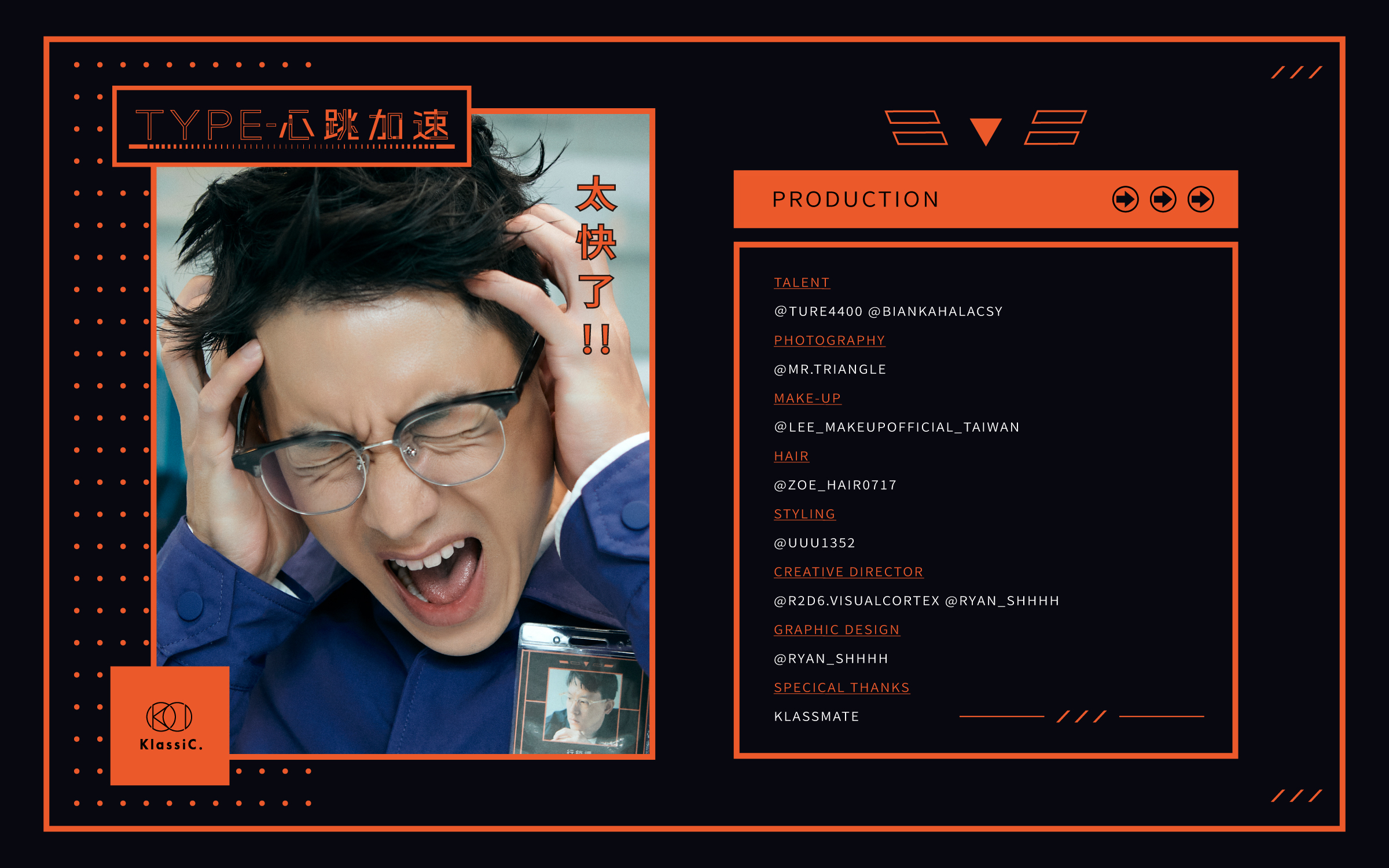 形象致敬 90 年代的電視影集與廣告,略有浮誇的表現情緒,結合不同的場景:辦公室、教室、超市、沙漠與林間(疑),詮釋,呼應著在不同地點、時間,戴上「TYPE - 心」便讓人心跳加速。