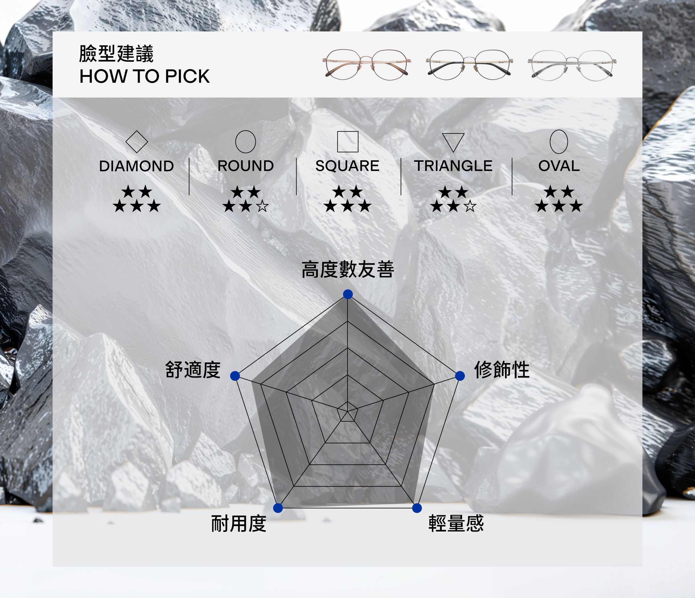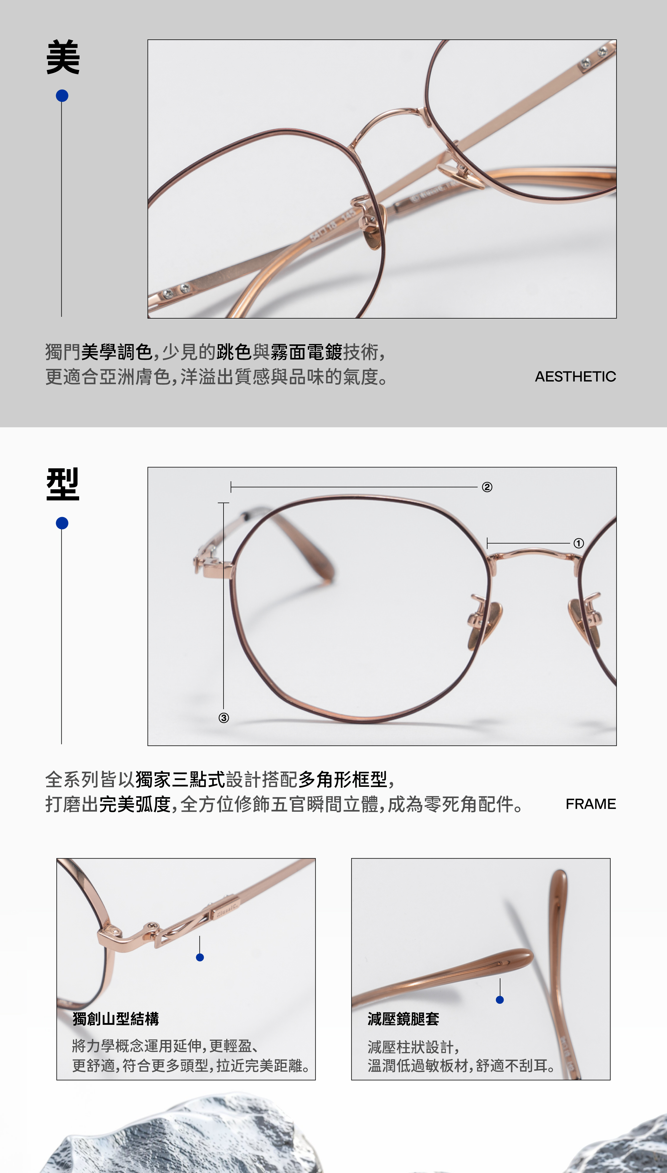 .三點式鏡框,不規則多邊框形,臉型修飾更立體