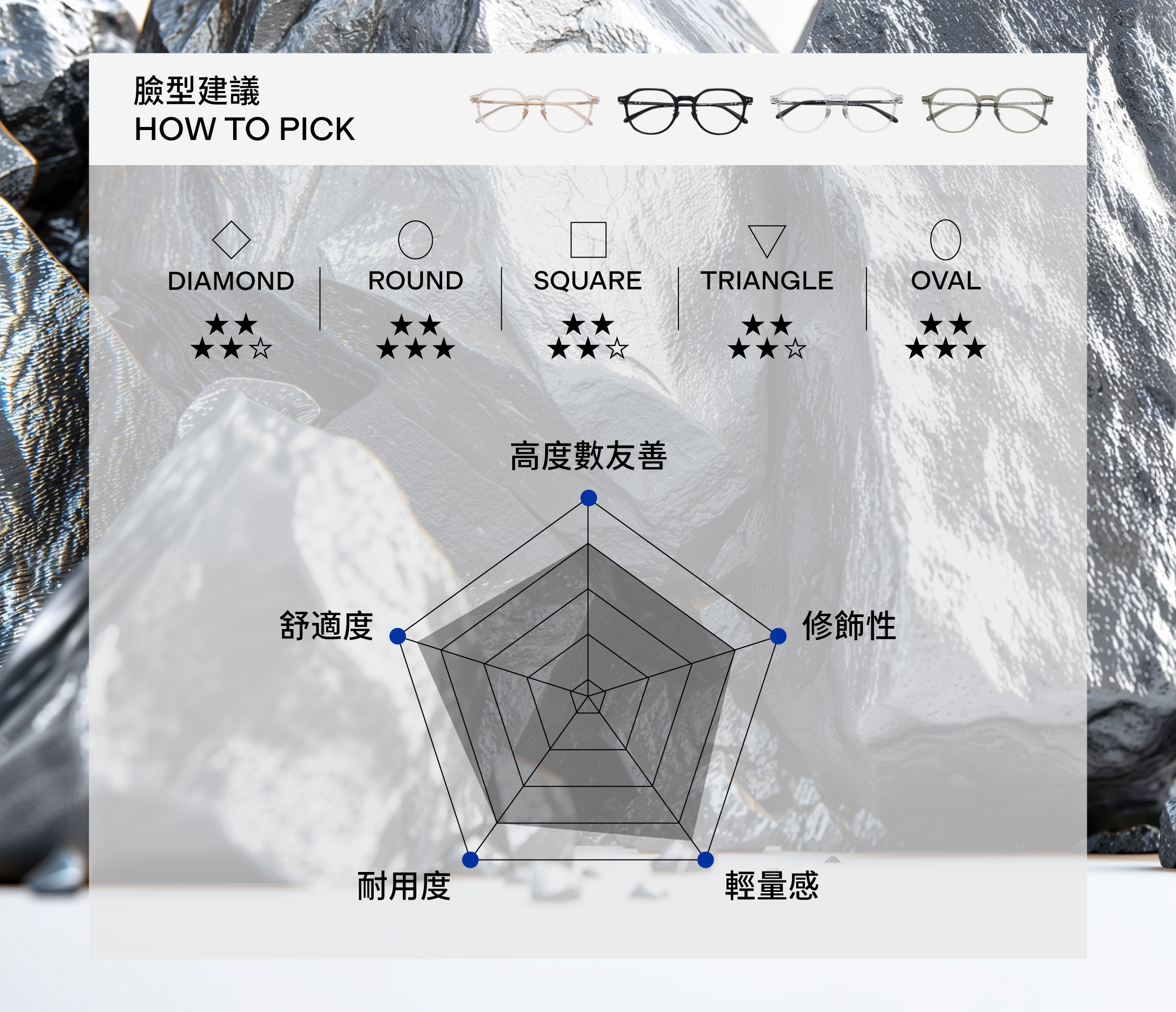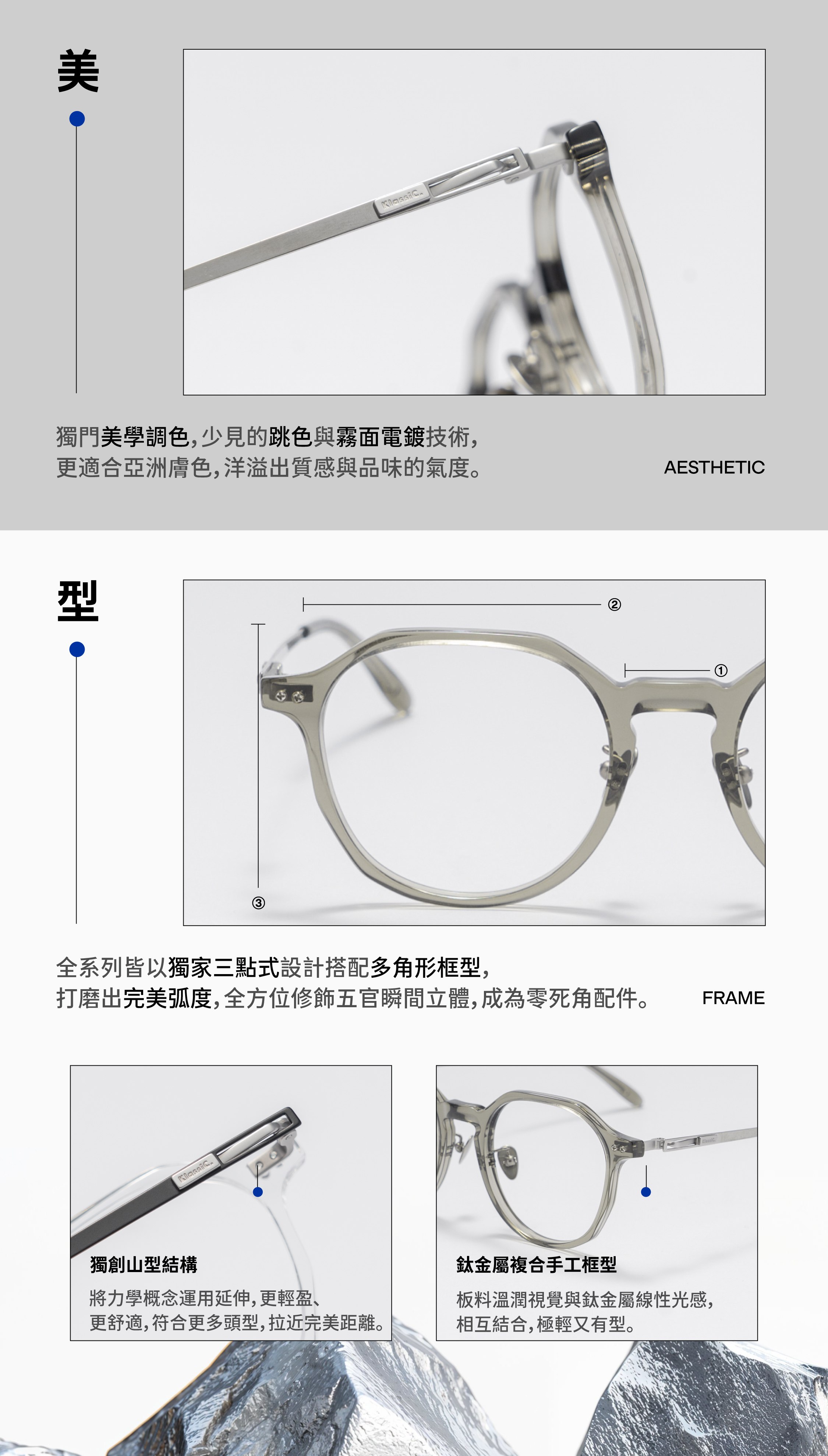 .三點式鏡框,不規則多邊框形,臉型修飾更立體