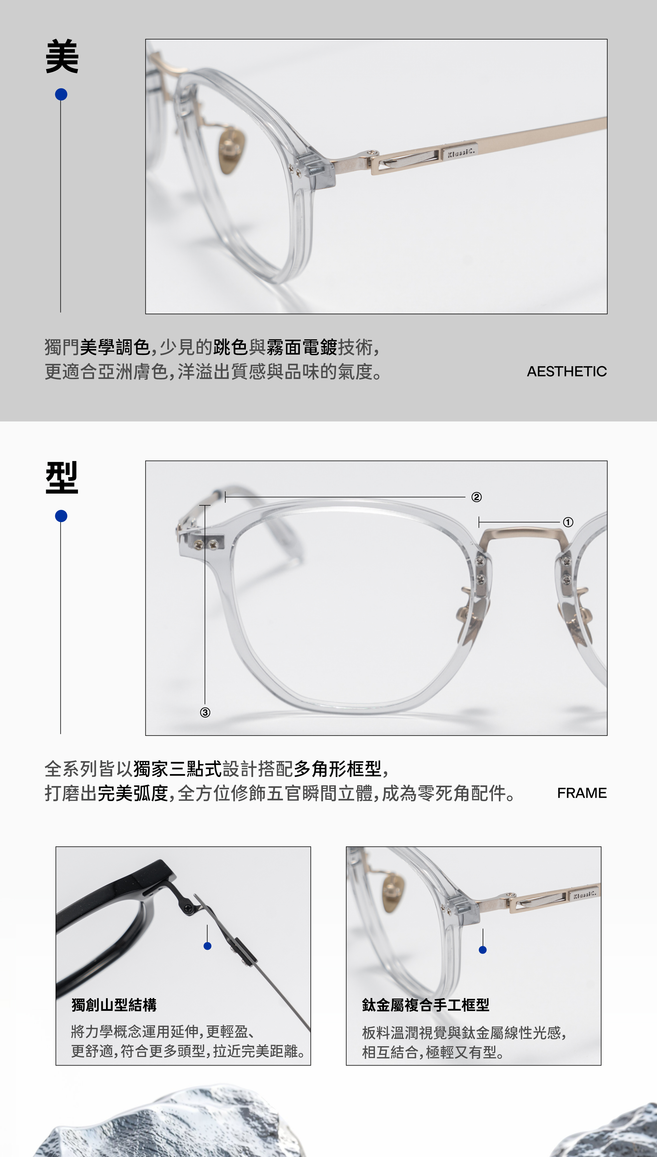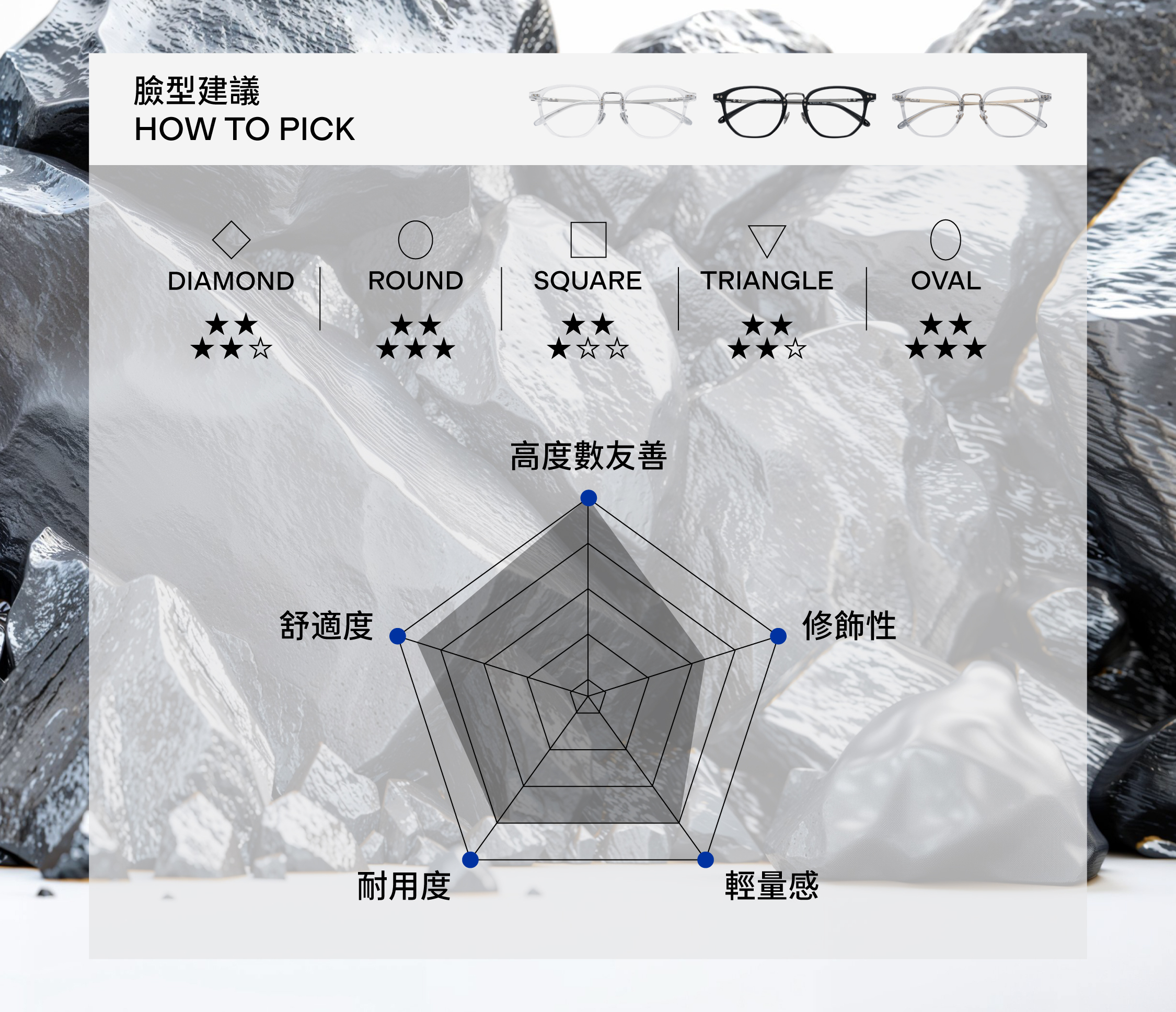.三點式鏡框,不規則多邊框形,臉型修飾更立體